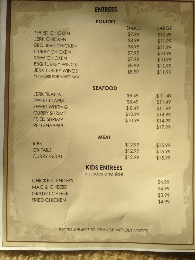 Caribbean-spiced goat meat, choice of medium or large. Sides: rice, plantains, cornbread, or cabbage.